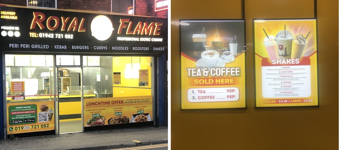 Welcome to Royal Flame Takeaway, your go-to destination for delicious halal food in Ashton-in-Makerfield. Conveniently located at 5 Wigan Rd, we offer a range of tasty options perfect for dinner, solo dining, or a quick bite. Enjoy our casual atmosphere while you savor our coffee, late-night food, and indulgent desserts. With options for kerbside pickup, no-contact delivery, and dine-in, we cater to your needs. Our commitment to excellent service ensures that your order will arrive promptly and hot. Join us for a truly delightful culinary experience—reservations are welcomed!The most lauded aspect of Royal Flame Takeaway is its menu diversity, featuring standout dishes that keep customers coming back for more. The set meal for two, available for just £10.99, offers an incredible value that resonates with many. Customers rave about the high-quality meat they use, which shines through in their curries and has established a loyal fan base. Poppadoms paired with flavorsome dips are also a favorite for many. The reliability of fast delivery and the piping hot results upon arrival are often highlighted in reviews, showcasing effective service and attention to detail. Many patrons appreciate the option for kerbside pickup, as it allows for easy collection of tasty meals, perfect for busy schedules. It’s no wonder the takeaway holds strong in the local dining scene with its commitment to both quality and community engagement.